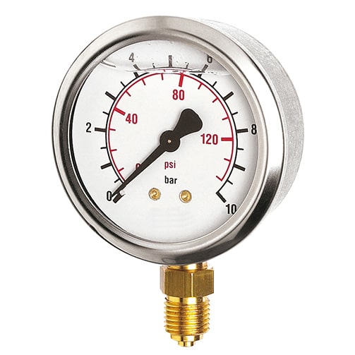 Манометр измерения давления Malgorani. Внутренняя камера устройства заполнена глицерином, что придает устойчивость указателю давления при вибрациях. Также глицерин является химически стабильной жидкостью, что в сочетании с корпусом из нержавеющей стали делает манометр устойчивым к коррозии, сохраняя длительное время свою точность и надежность.