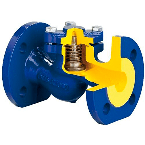 Проходное отверстие клапана открывается под воздействием потока рабочей среды, а запирается от давления пружины. Поэтому устройство допускается устанавливать на вертикальном трубопроводе